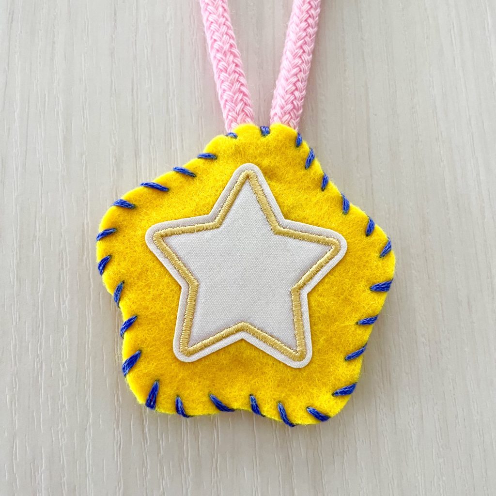 ↓2つ縫い終わりました!ワッペンのデザイン、紐やふちの縫い方を変えただけで自分だけの世界に1つだけのオリジナルネームタグが出来上がりました!