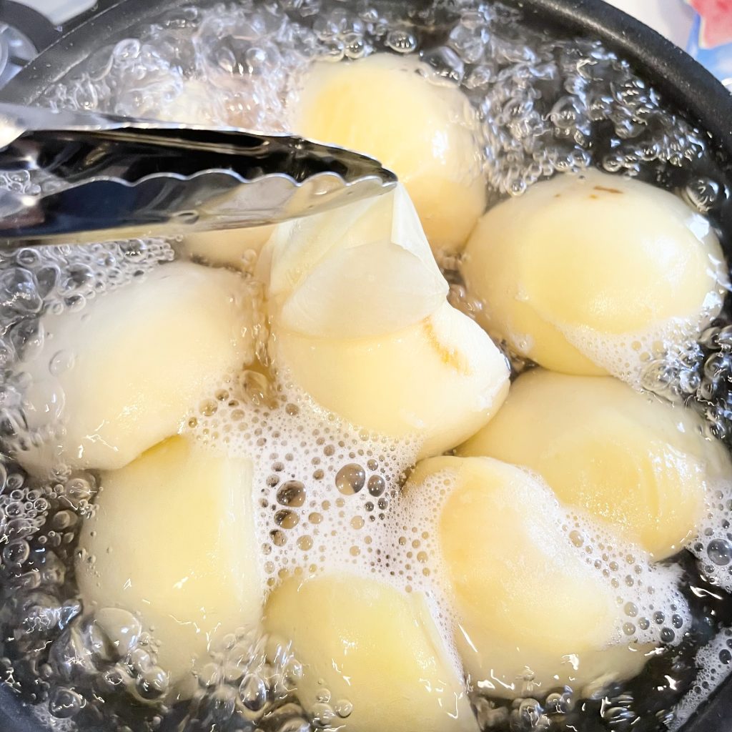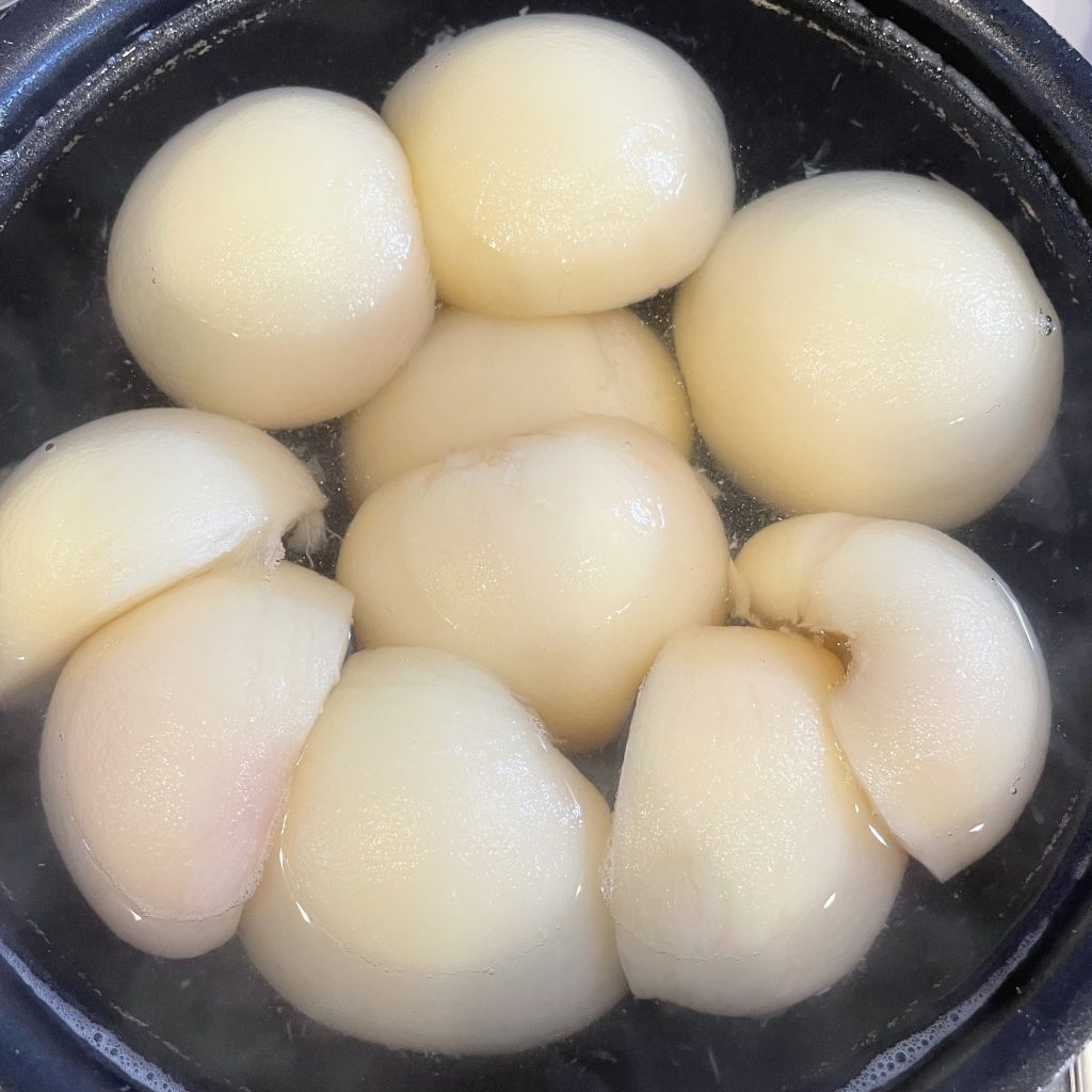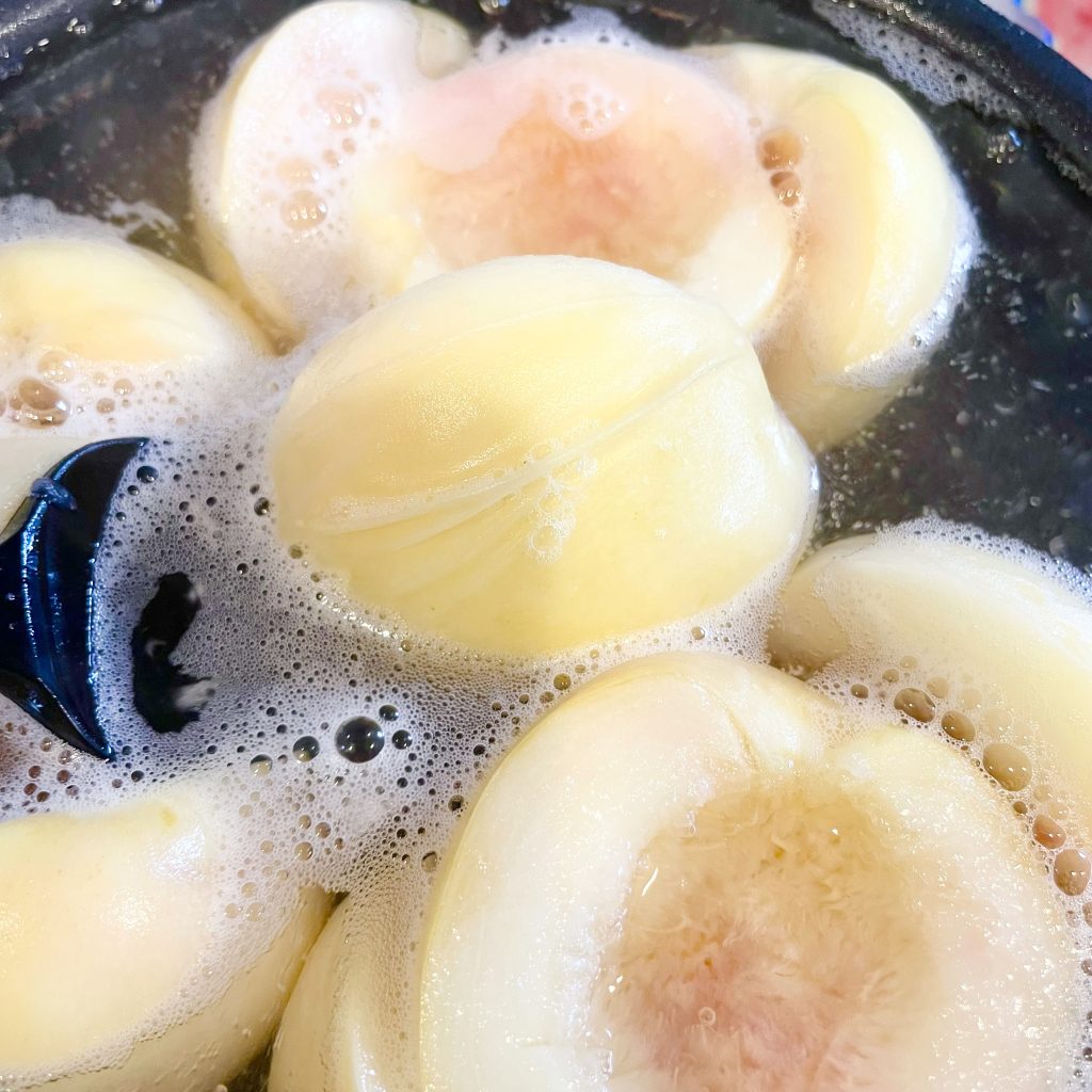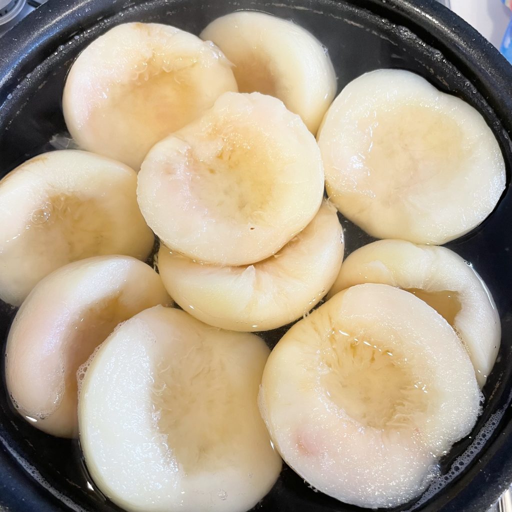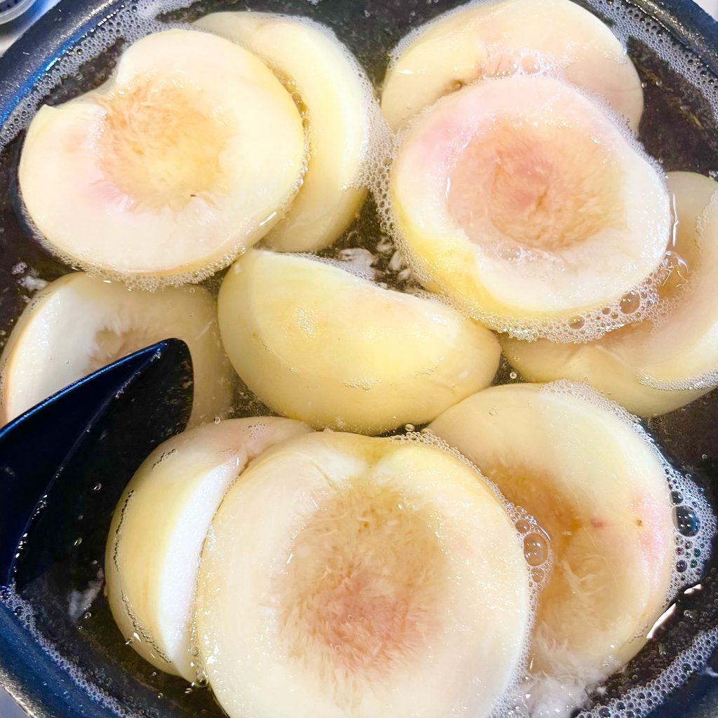 ↓桃を入れた後、ふたたび沸騰してから弱火で10分煮ました。